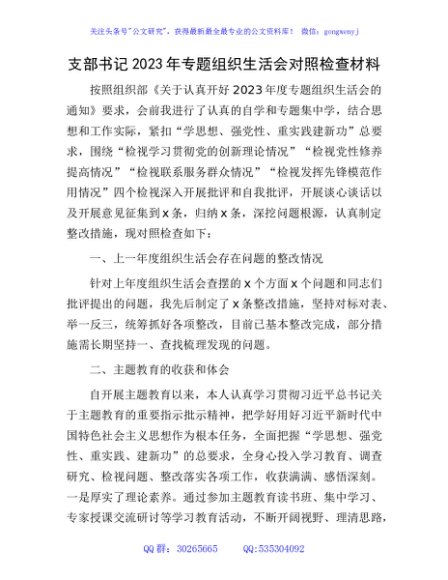 (支部班子)2023年度主题教育专题组织生活会六个方面对照检查材料