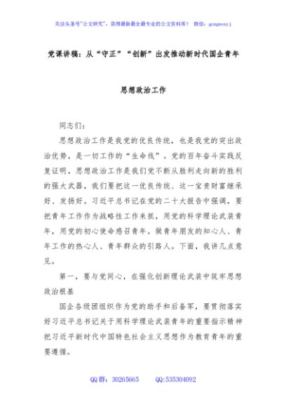 / 党课讲稿:从“守正”“创新”出发推动新时代国企青年思想政治工作