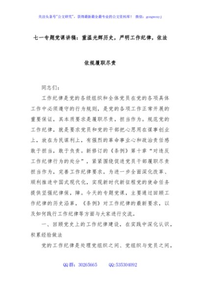 / 七一专题党课讲稿:重温光辉历史,严明工作纪律,依法依规履职尽责