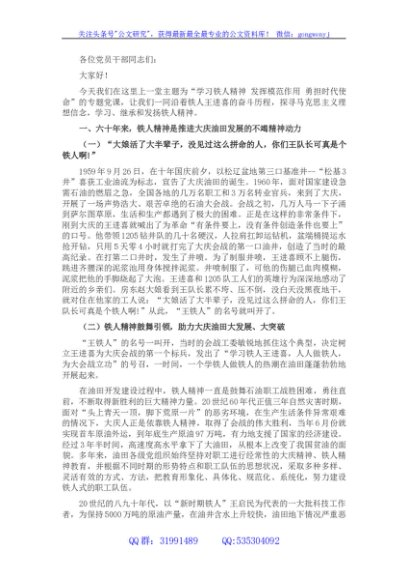/ 优良传统党课:学习铁人精神 发挥模范作用 勇担时代使命
