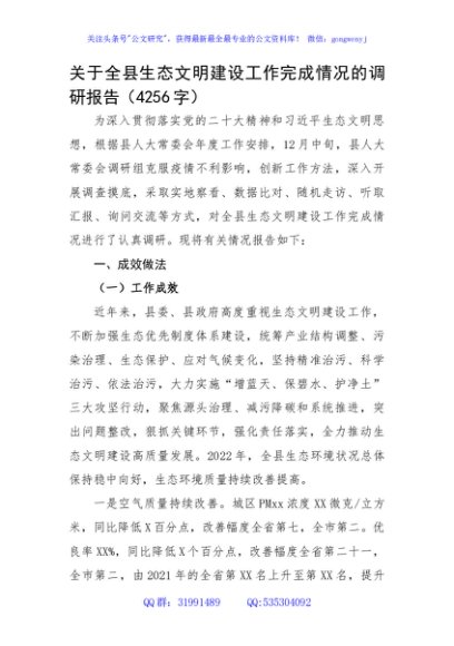 / 关于全县生态文明建设工作完成情况的调研报告