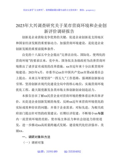/ 2023年大兴调查研究关于营商环境和企业创新评价调研报告