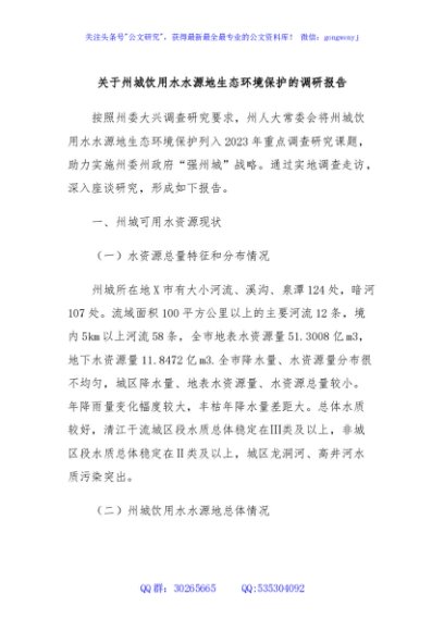 / 关于州城饮用水水源地生态环境保护的调研报告