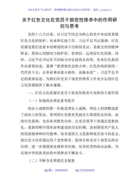 / 红色文化在党员干部党性修养中的作用研究与思考(调研报告)