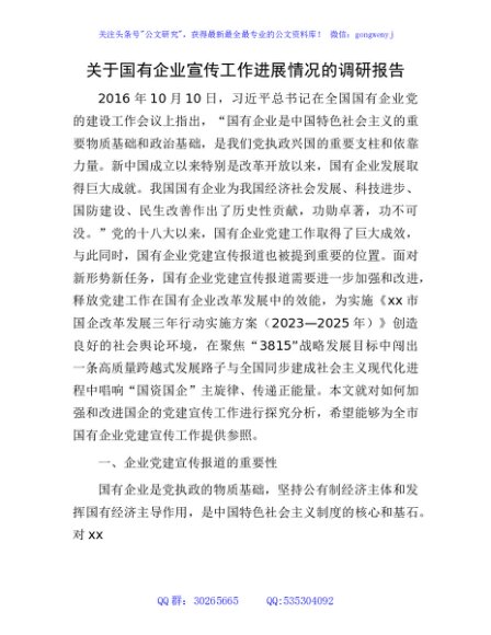 / 国企公司宣传工作进展情况的调研报告
