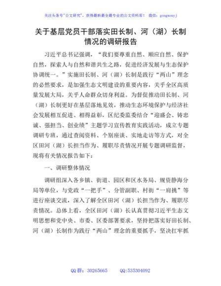 / 基层党员干部落实田长制、河(湖)长制情况的调研报告