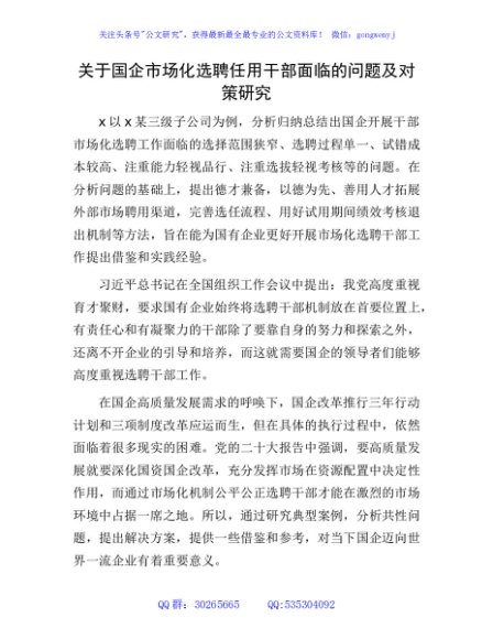 / 国企公司市场化选聘任用干部面临的问题及对策研究(调研报告)