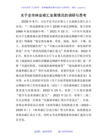 / 全市林业碳汇发展情况的调研与思考(调研报告)