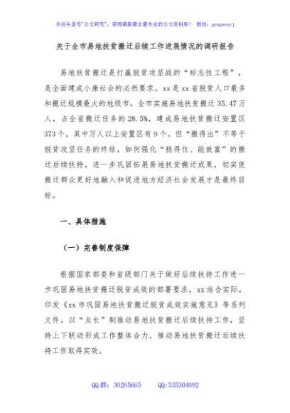 / 关于全市易地扶贫搬迁后续工作进展情况的调研报告