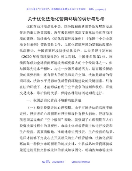 / 优化法治化营商环境的调研与思考(调研报告)