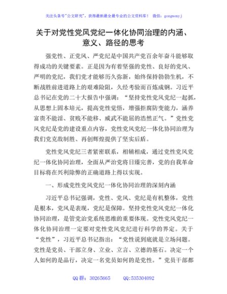 对党性党风党纪一体化协同治理的内涵、意义、路径的思考(调研报告)