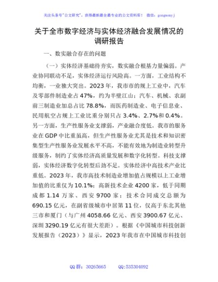 / 全市数字经济与实体经济融合发展情况的调研报告