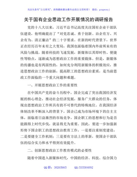 / 国有企业思政工作开展情况的调研报告