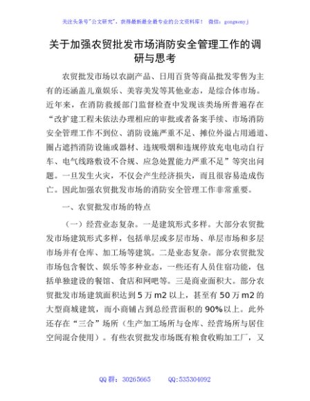 / 加强农贸批发市场消防安全管理工作的调研与思考(调研报告)