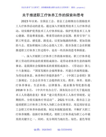 / 推进职工疗休养工作的探索和思考(调研报告)
