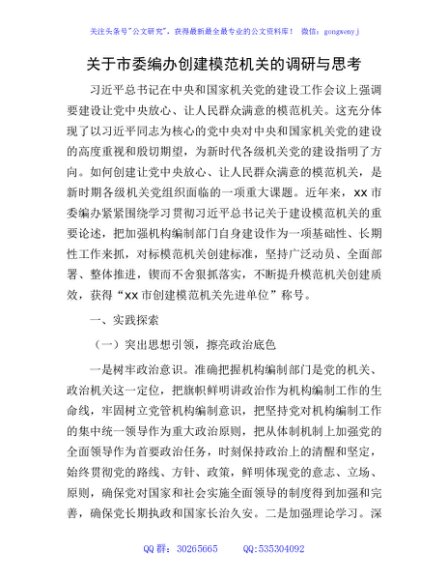 市委编办创建模范机关的调研与思考(调研报告)