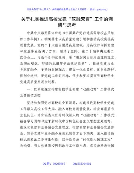 / 扎实推进高校党建“双融双育”工作的调研与思考(调研报告)