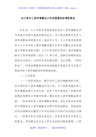 / 关于某市人居环境整治工作进展情况的调研报告