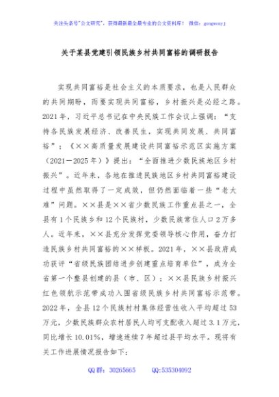 / 关于某县党建引领民族乡村共同富裕的调研报告