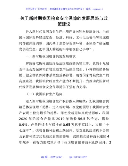 新时期我国粮食安全保障的发展思路与政策建议(调研报告)