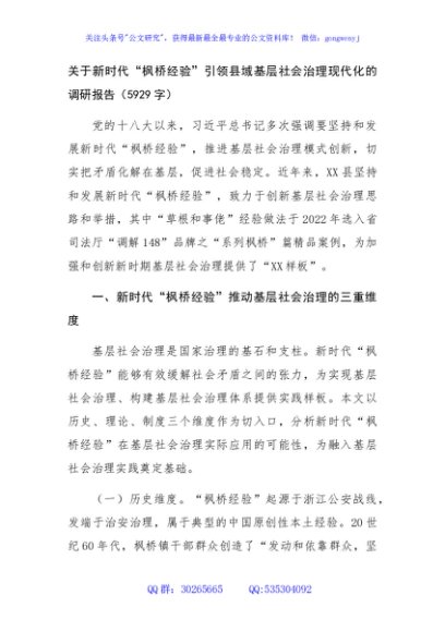 / 关于新时代“枫桥经验”引领县域基层社会治理现代化的调研报告(5929字)