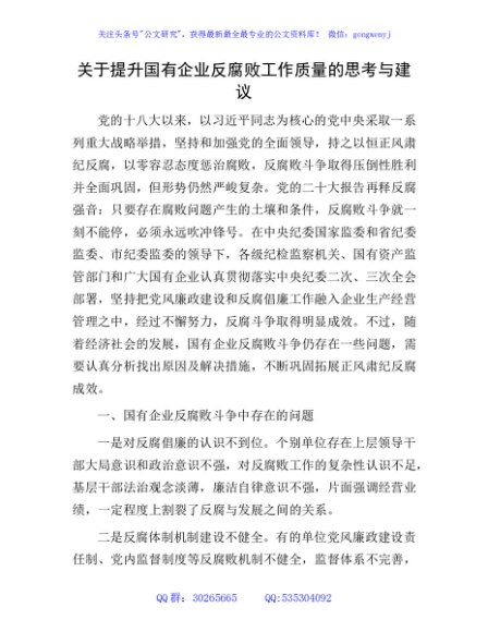 / 提升国有企业反腐败工作质量的思考与建议(调研报告)