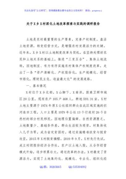 / 关于X乡X村深化土地改革探索与实践的调研报告