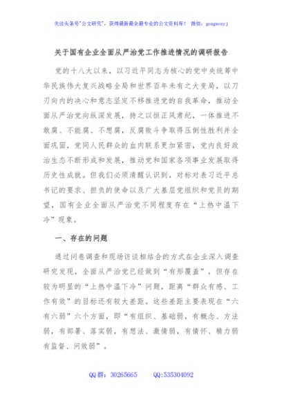 / 关于国有企业全面从严治党工作推进情况的调研报告