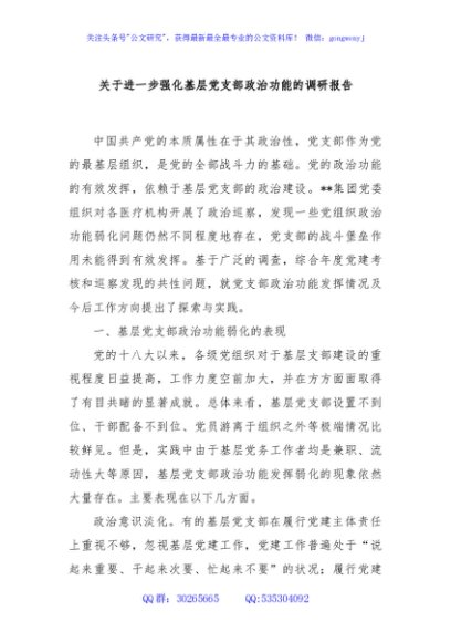 / 关于进一步强化基层党支部政治功能的调研报告
