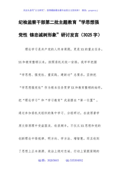 / 纪检监察干部第二批主题教育“学思想强党性 铸忠诚树形象”研讨发言