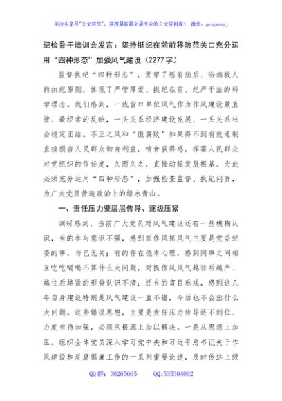 / 纪检骨干培训会发言:坚持挺纪在前前移防范关口充分运用“四种形态”加强风气建设