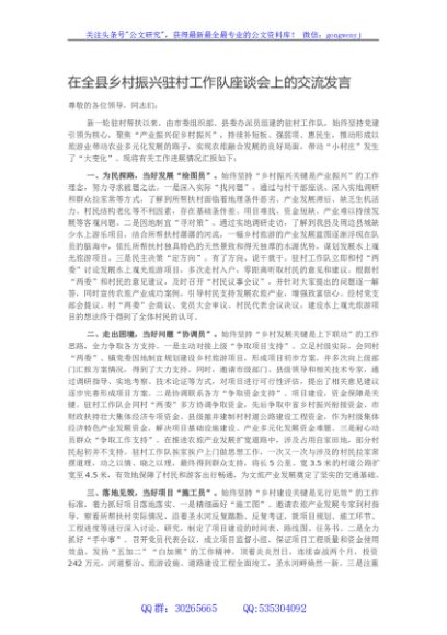 / 在全县乡村振兴驻村工作队座谈会上的交流发言