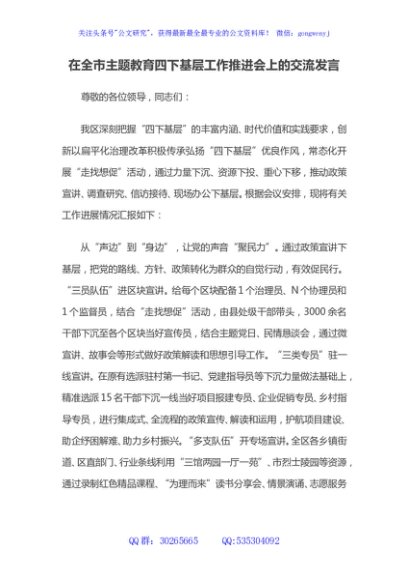 未生成预览图,长按二维码添加 在全市主题教育四下基层工作推进会上的交流发言 - 公文研究