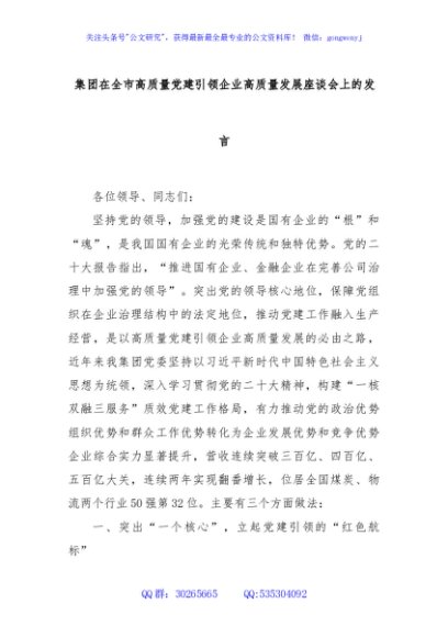 / 集团在全市高质量党建引领企业高质量发展座谈会上的发言