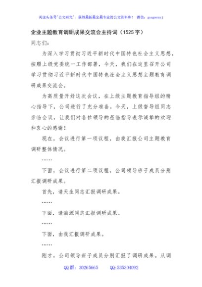 / 国企主题教育调研成果交流会主持词
