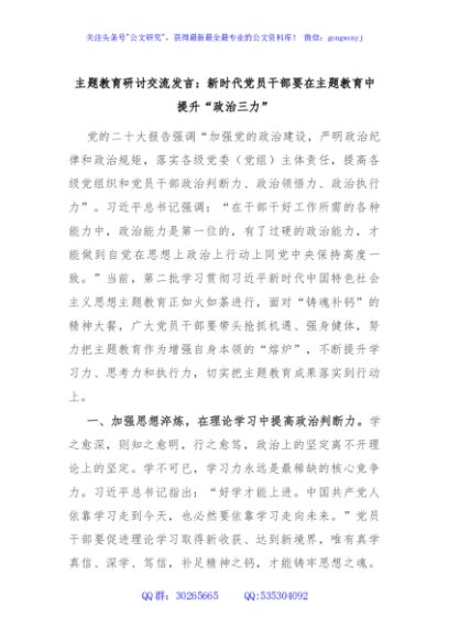 / 主题教育研讨交流发言:新时代党员干部要在主题教育中提升“政治三力”