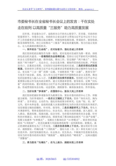 / 市委秘书长在全省秘书长会议上的发言:干在实处 走在前列 以高质量“三服务”助力高质量发展