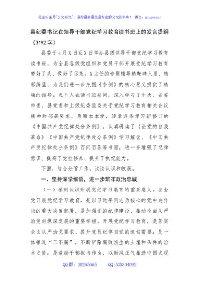 / 县纪委书记在领导干部党纪学习教育读书班上的发言提纲(3192字)
