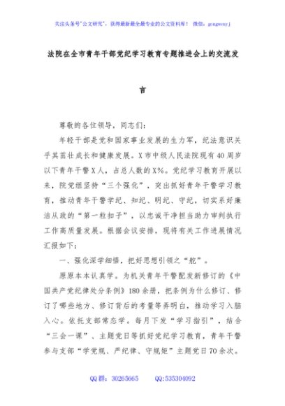 / 法院在全市青年干部党纪学习教育专题推进会上的交流发言