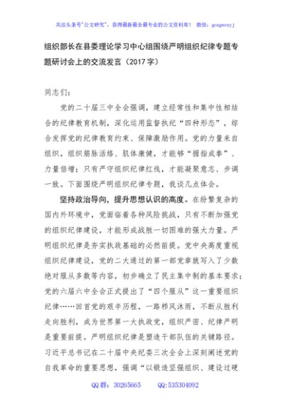 / 组织部长在县委理论学习中心组围绕严明组织纪律专题专题研讨会上的交流发言(2017字)