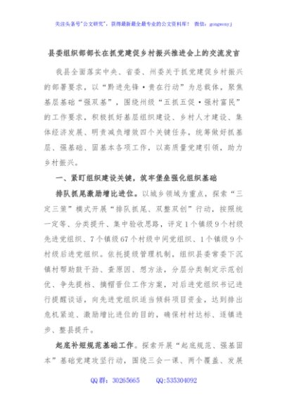 / 县委组织部部长在抓党建促乡村振兴推进会上的交流发言