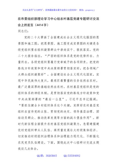 / 在市委组织部理论学习中心组农村基层党建专题研讨交流会上的发言(4414字)