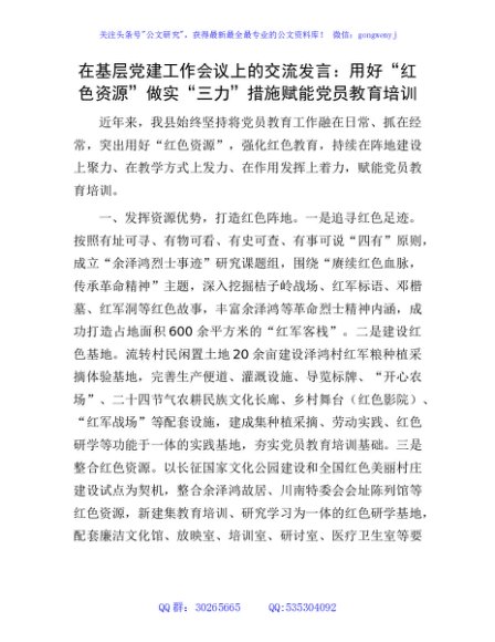 / 在基层党建工作会议上的交流发言:用好“红色资源” 做实“三力”措施赋能党员教育培训