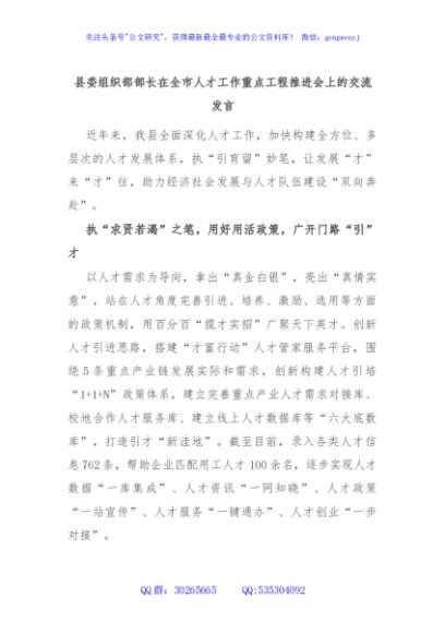 未生成预览图,长按二维码添加 县委组织部部长在全市人才工作重点工程推进会上的交流发言 - 公文研究