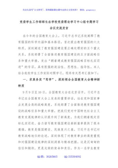 党委学生工作部部长在学校党委理论学习中心组专题学习会议交流发言