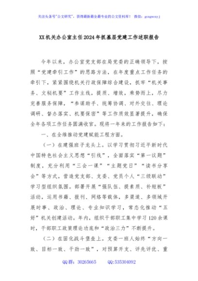 / XX机关办公室主任2024年抓基层党建工作述职报告
