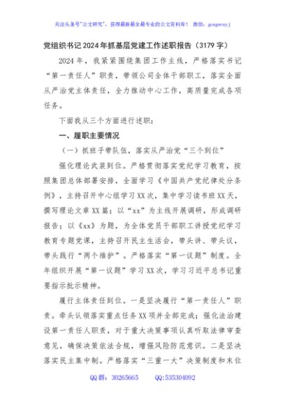 / 党组织书记2024年抓基层党建工作述职报告(3179字)