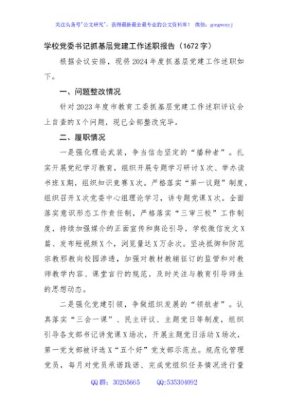 / 学校党委书记抓基层党建工作述职报告(1672字)
