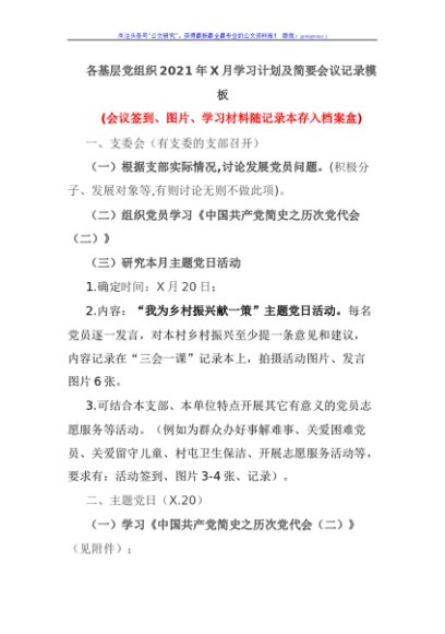 各基层党组织2021年X月学习计划及简要会议记录模板