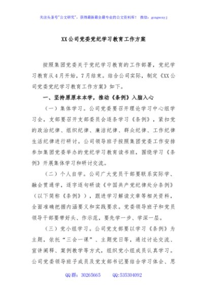 / XX公司党委党纪学习教育工作方案